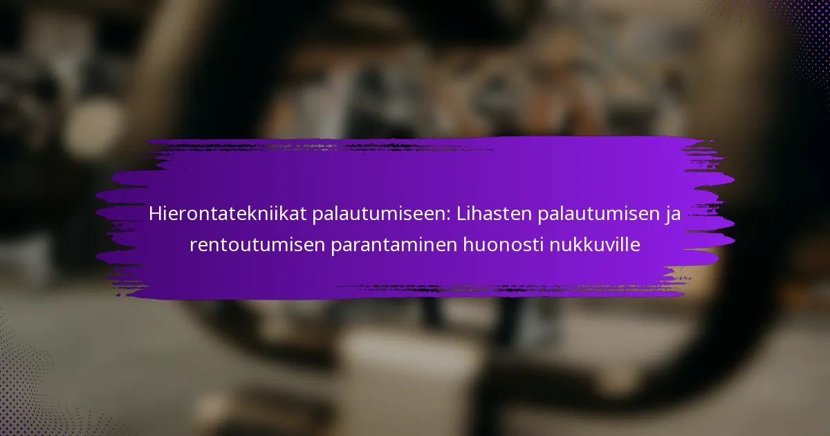 Tehokkaat hierontatekniikat lihasten palautumiseen keskittyvät rentoutumisen parantamiseen, kivun vähentämiseen ja yleisen hyvinvoinnin edistämiseen. Eri menetelmät palvelevat erilaisia tarpeita, joten on tärkeää valita oikea tekniikka yksilöllisten mieltymysten ja erityisten palautumistavoitteiden mukaan.