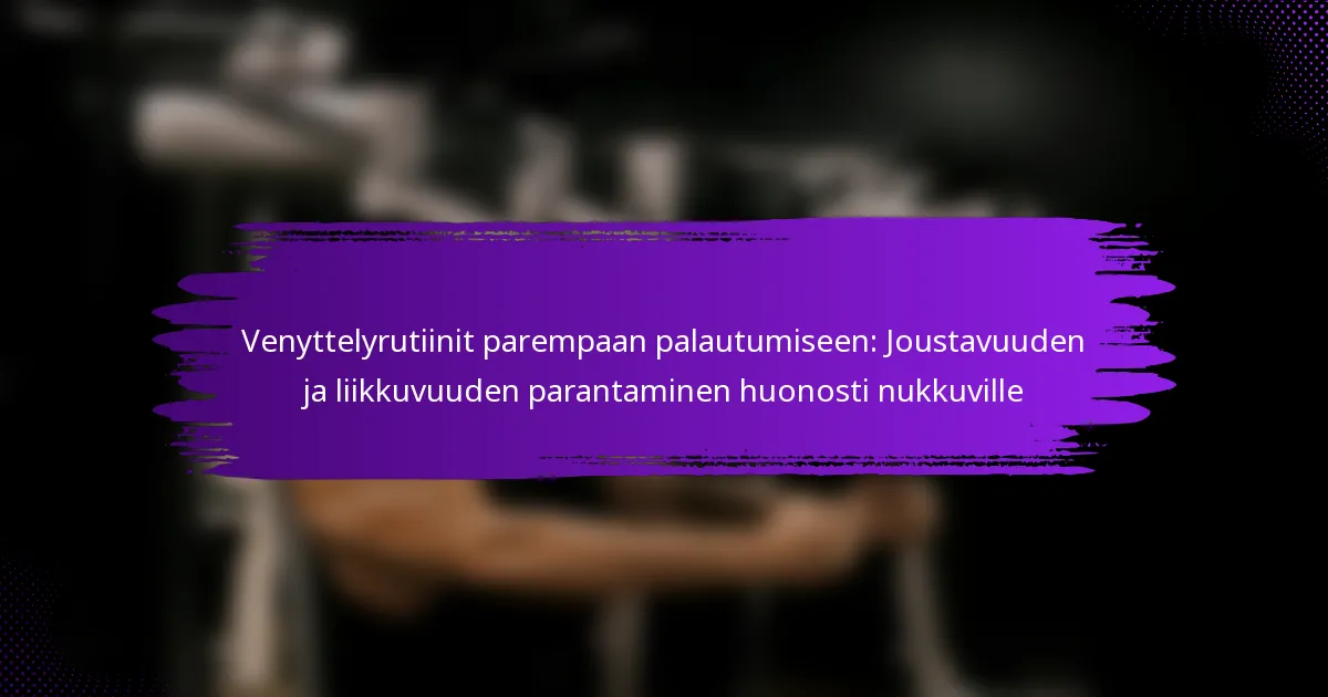 Venyttelyrutiinit voivat näytellä ratkaisevaa roolia palautumisen parantamisessa henkilöillä, jotka kamppailevat unen kanssa. Parantamalla joustavuutta ja liikkuvuutta, nämä rutiinit auttavat lievittämään lihasjännitystä ja edistämään rentoutumista, mikä lopulta johtaa parempaan unen laatuun. Sekä staattisten että dynaamisten venytysten sisällyttäminen päivittäiseen harjoitteluusi voi merkittävästi auttaa saavuttamaan rauhallisemman yön.